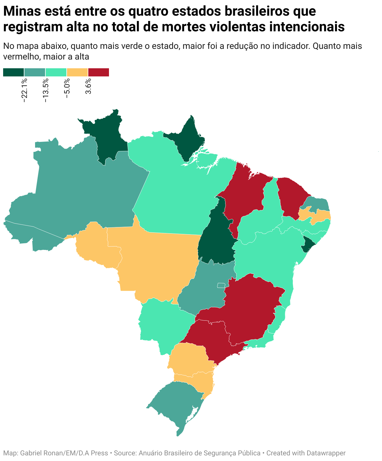 Só em quatro estados brasileiros houve aumento na taxa de mortes violentas intencionais por 100 mil habitantes: Maranhão (12,1%), Ceará (10,9%) e São Paulo (7,5%), além de Minas Gerais.