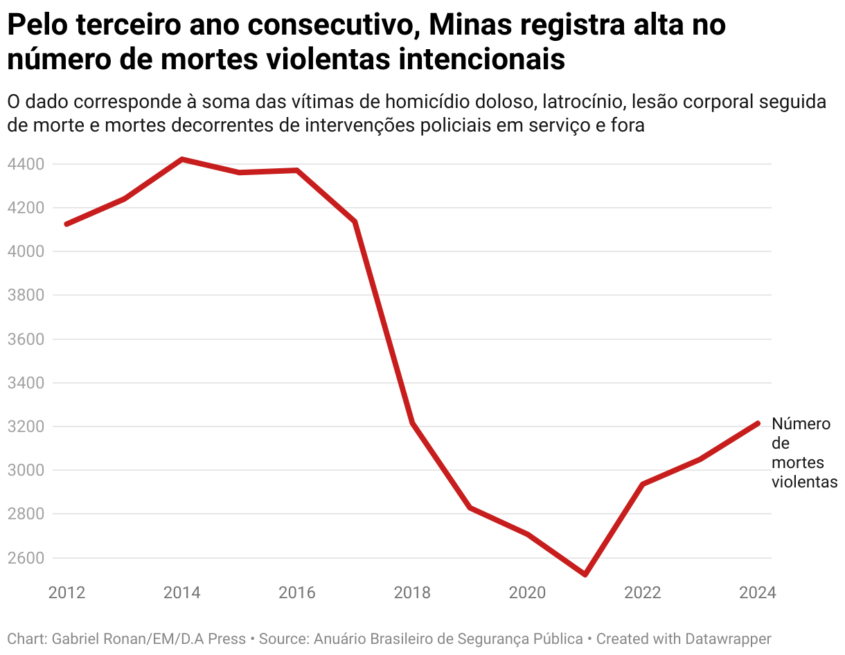 Siga noMinas Gerais registrou nova alta no número de mortes violentas intencionais em 2024, mostra a edição mais recente do Anuário Brasileiro de Segurança Pública, divulgada nesta quinta-feira (24). É a terceira vez consecutiva que o estado computa aumento no dado.