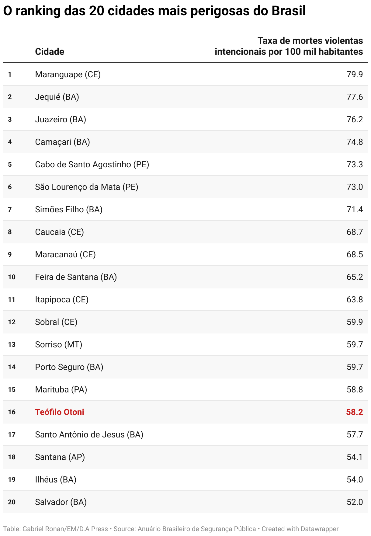 Veja, abaixo, o top-20 cidades mais violentas do país. Não conseguiu visualizar a tabela? Clique aqui.