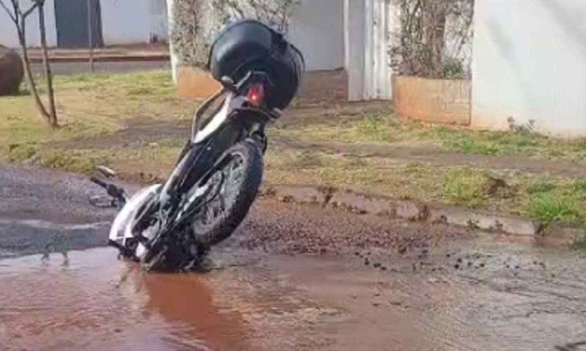 Dano na tubulação de água causou infiltração e consequente erosão na rua. Motorista ainda conseguiu filmar com celular a moto presa na cratera