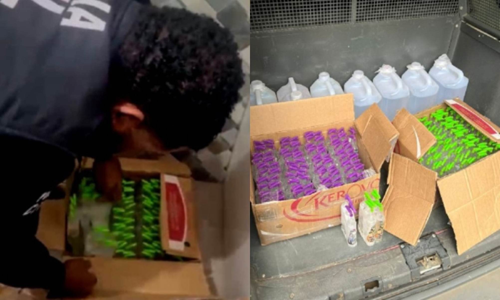 A polícia encontrou a substância em um cômodo ainda não reformado. Ao todo, foram apreendidos mais de 30 litros de loló em galões e cerca de 250 frascos.