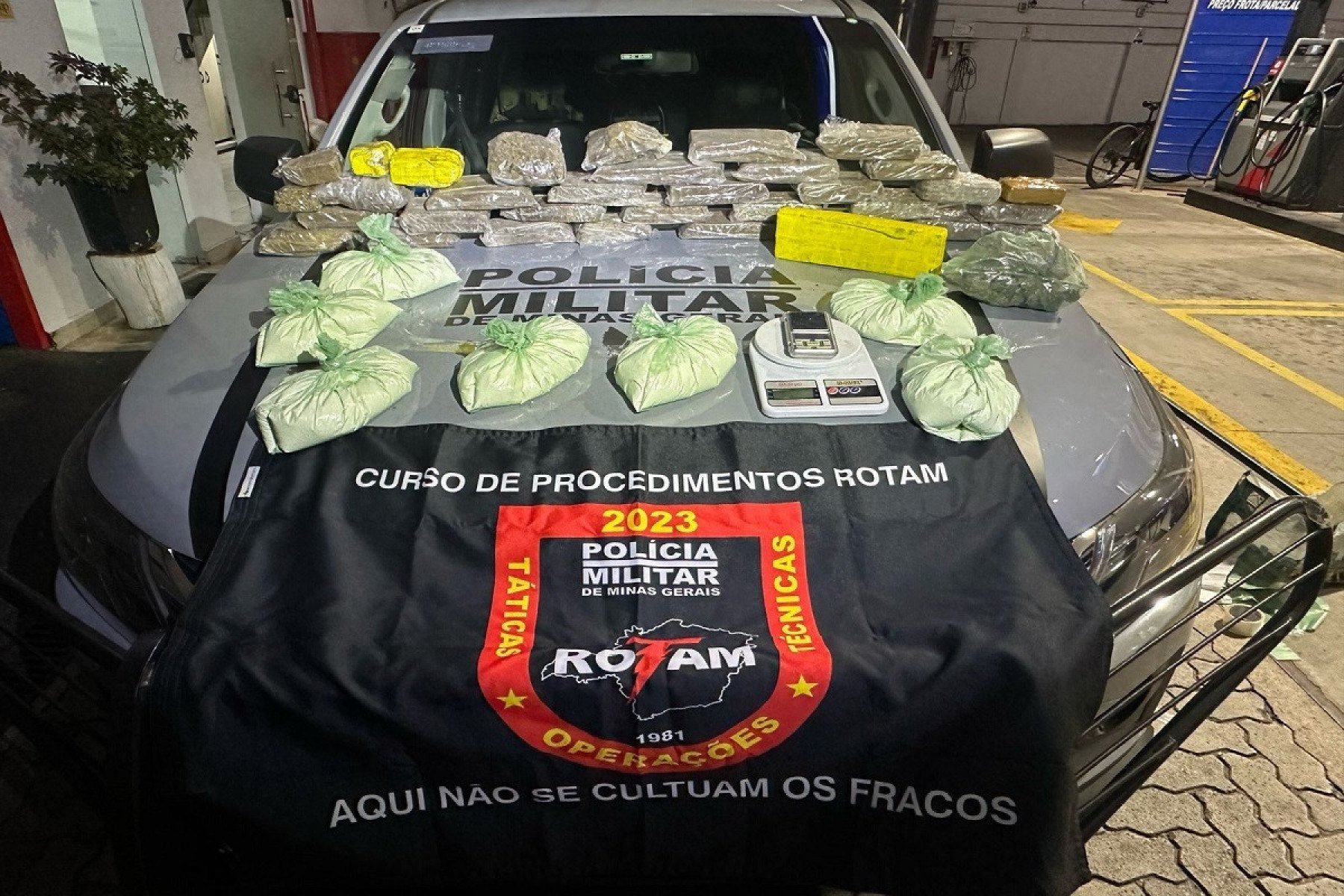 Na residência, foram encontradas 26 barras de maconha, sete quilos de cocaína, sete porções de maconha e duas balanças de precisão. O material foi apreendido e levado para a Delegacia de Plantão de Betim.