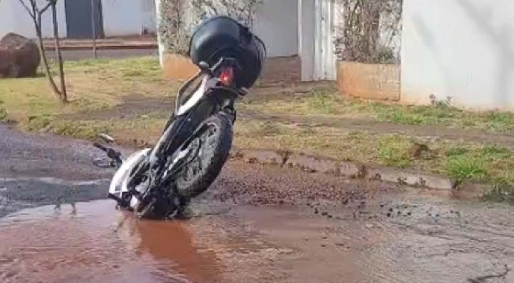 O caso foi registrado na Rua Dom Almir Ferreira, no bairro Morada da Colina, zona sul da cidade. O motociclista contou que transitava pelo local em que água vazava e o asfalto cedeu, deixando a moto presa pela roda da frente. No vídeo ele alerta para o risco que correu, uma vez que a motocicleta ainda estava acelerando.