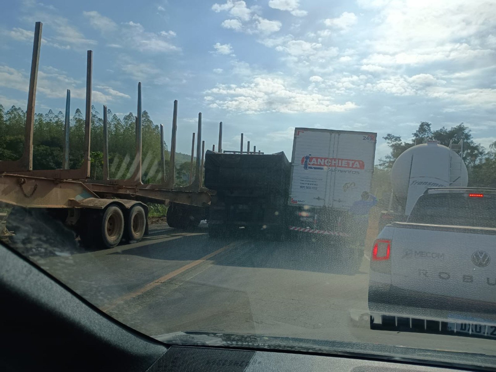 Com três veículos parados e interditando a rodovia, a passagem estava sendo realizada pelo acostamento, mas um caminhão caiu na vala durante a passagem e ficou entalado, bloqueando a passagem.