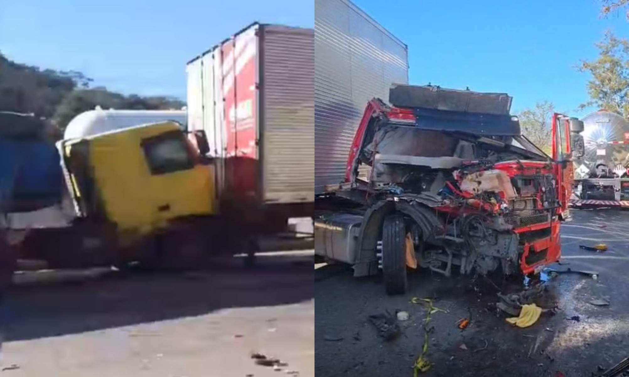 Imagens que circulam nas redes sociais mostram um caminhão com a cabine amassada na traseira de uma carreta, que também está com a cabine danificada.