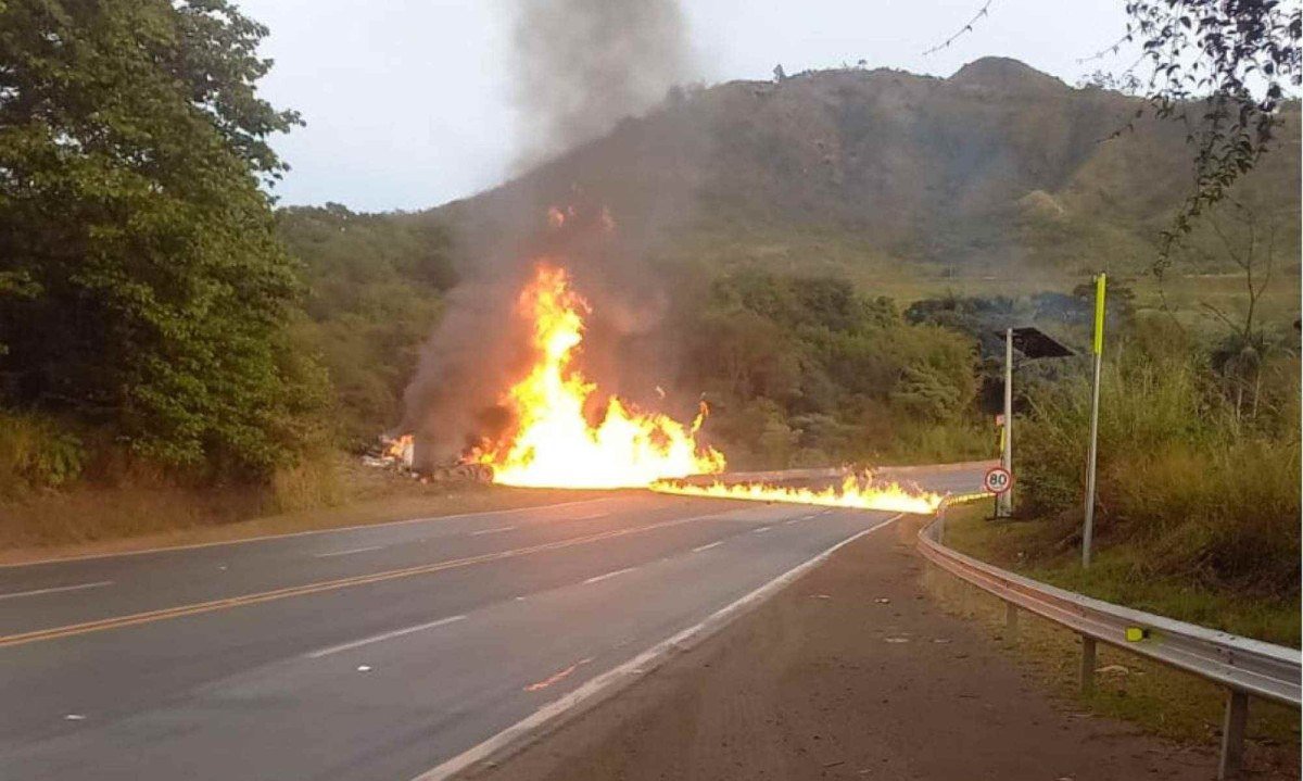 MG: caminhão-tanque tomba, pega fogo e interdita BR-040, em Congonhas