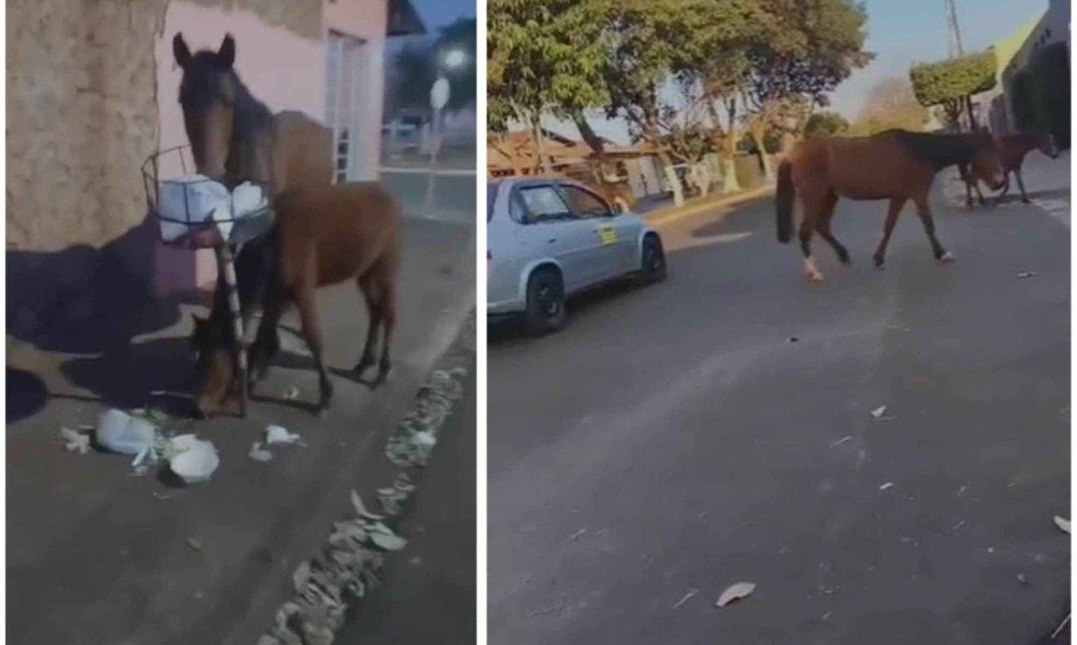 Vídeo: cavalos comem lixo e quase são atropelados em cidade de MG