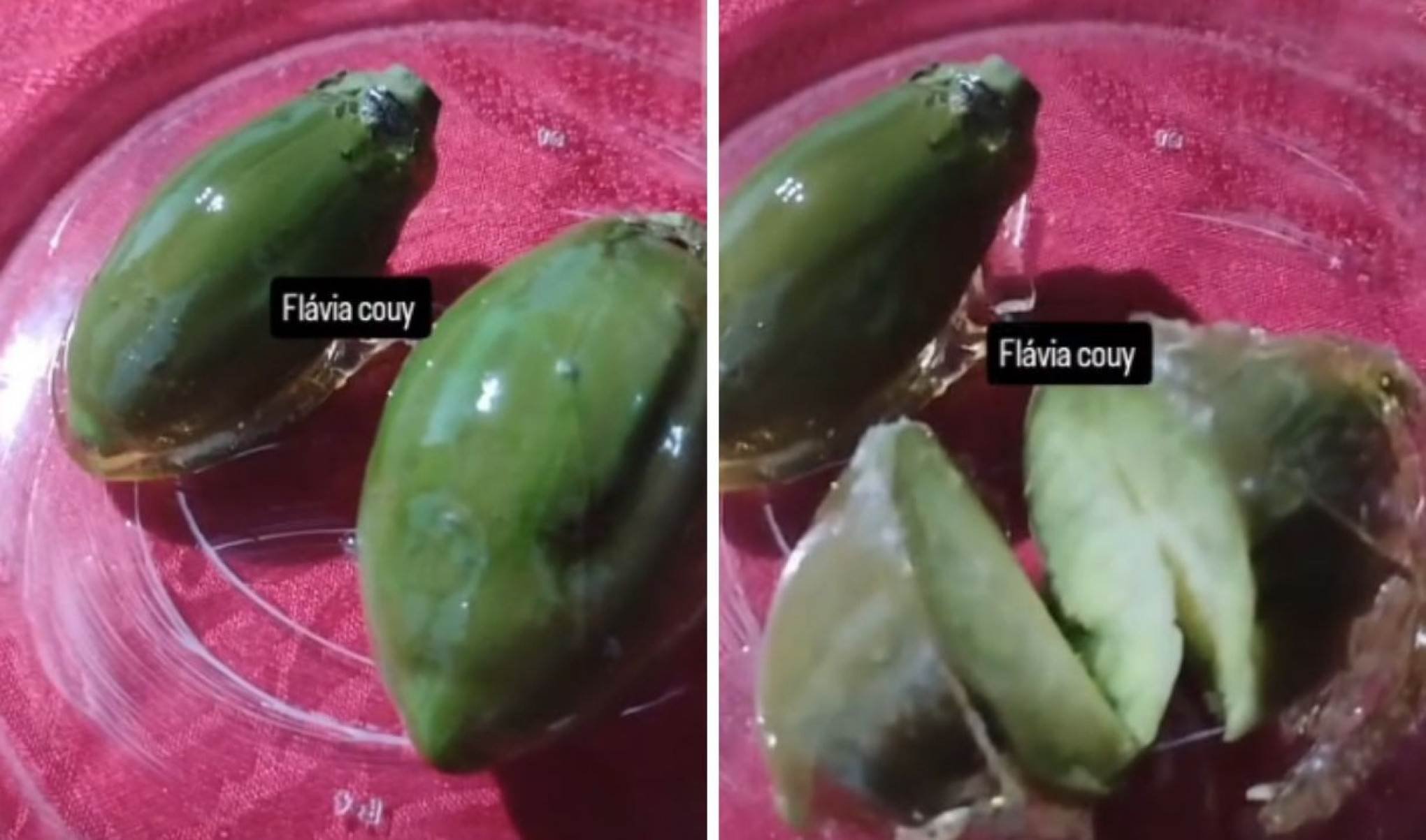 "A relação começa docinha, e muitas vezes, no final termina amarga", diz Flávia no vídeo que vem circulando nas redes sociais. Com voz firme e um sorriso irônico, ela mostra o fruto coberto com caramelo, como o doce viral.