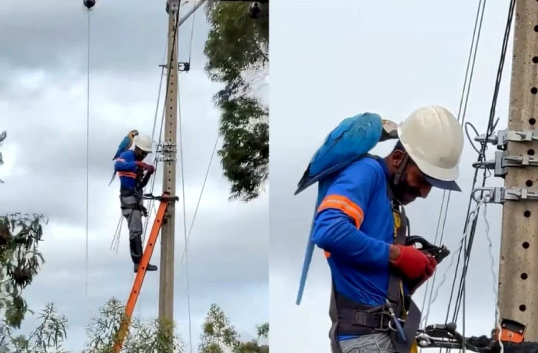 No vídeo, a arara se aproxima do técnico com naturalidade, pousa em seu ombro, bica seu capacete e até tenta retirar seu equipamento de proteção. Apesar da surpresa, André lida com a situação com bom humor e tranquilidade, enquanto a ave rouba a cena com sua ousadia e simpatia.