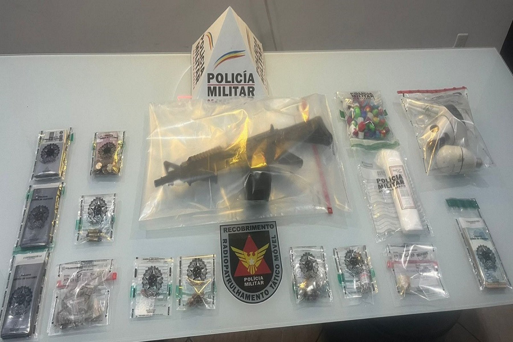 E dentro da casa, ao realizar buscas, os policiais encontraram: três pedras grandes de crack, oito buchas de maconha, três porções de maconha, um tablete de maconha, dois papelotes de cocaína, três munições CBC .38, um frasco de Cloridrato de Bupivacaína, R$ 630,00 em dinheiro, uma balança de precisão, dois celulares, um Simulacro carabina .556, duas câmeras de monitoramento, diversos Slicks de silicone para acondicionar e conservar drogas e diversos sacos tipo chuck para embalar drogas.