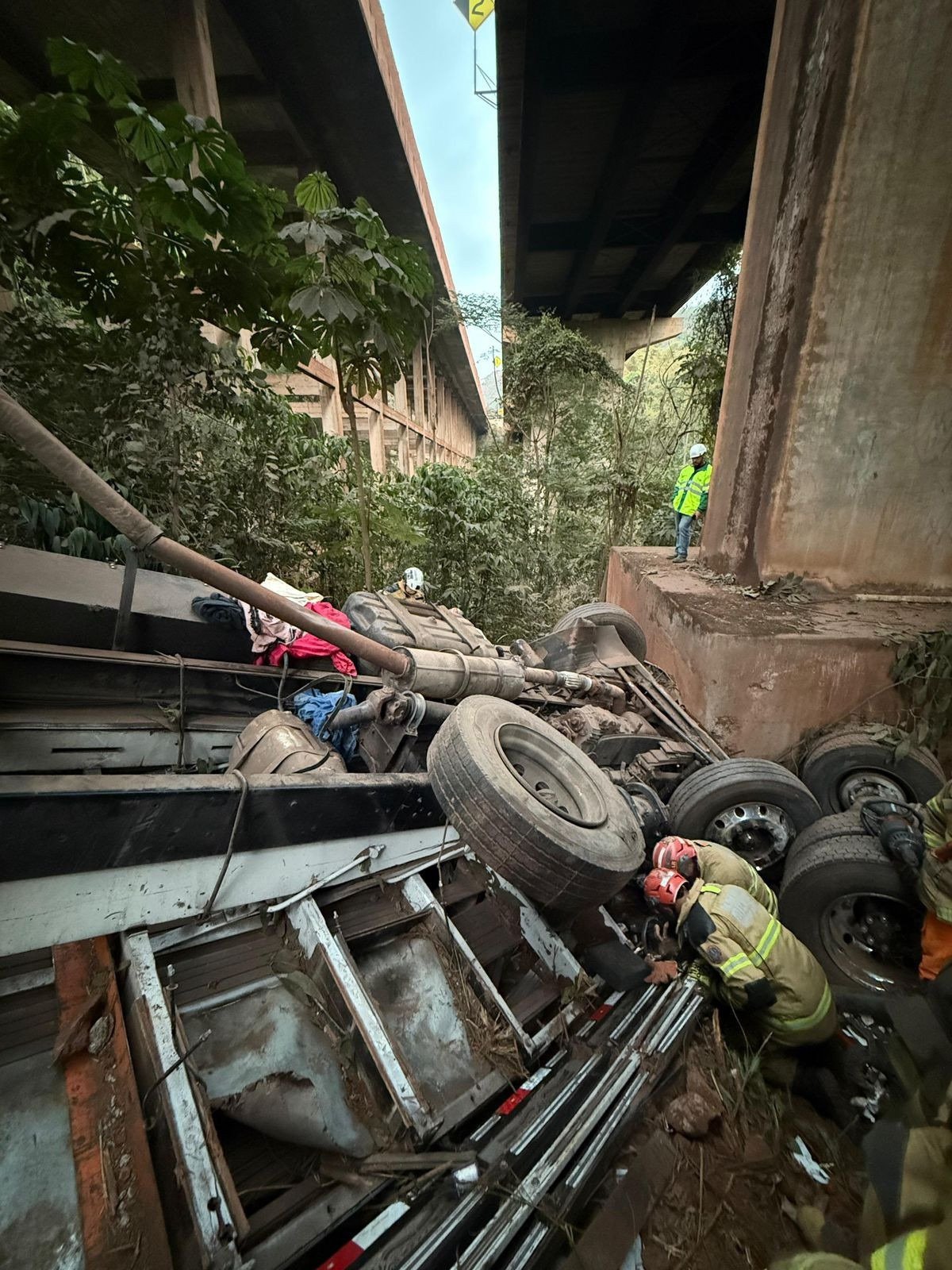 Já a passageira ficou presa às ferragens, sob o caminhão, em um ponto de difícil acesso. A operação de resgate exigiu a estabilização do veículo para garantir a segurança das equipes e evitar novos deslizamentos, informou o Corpo de Bombeiros.