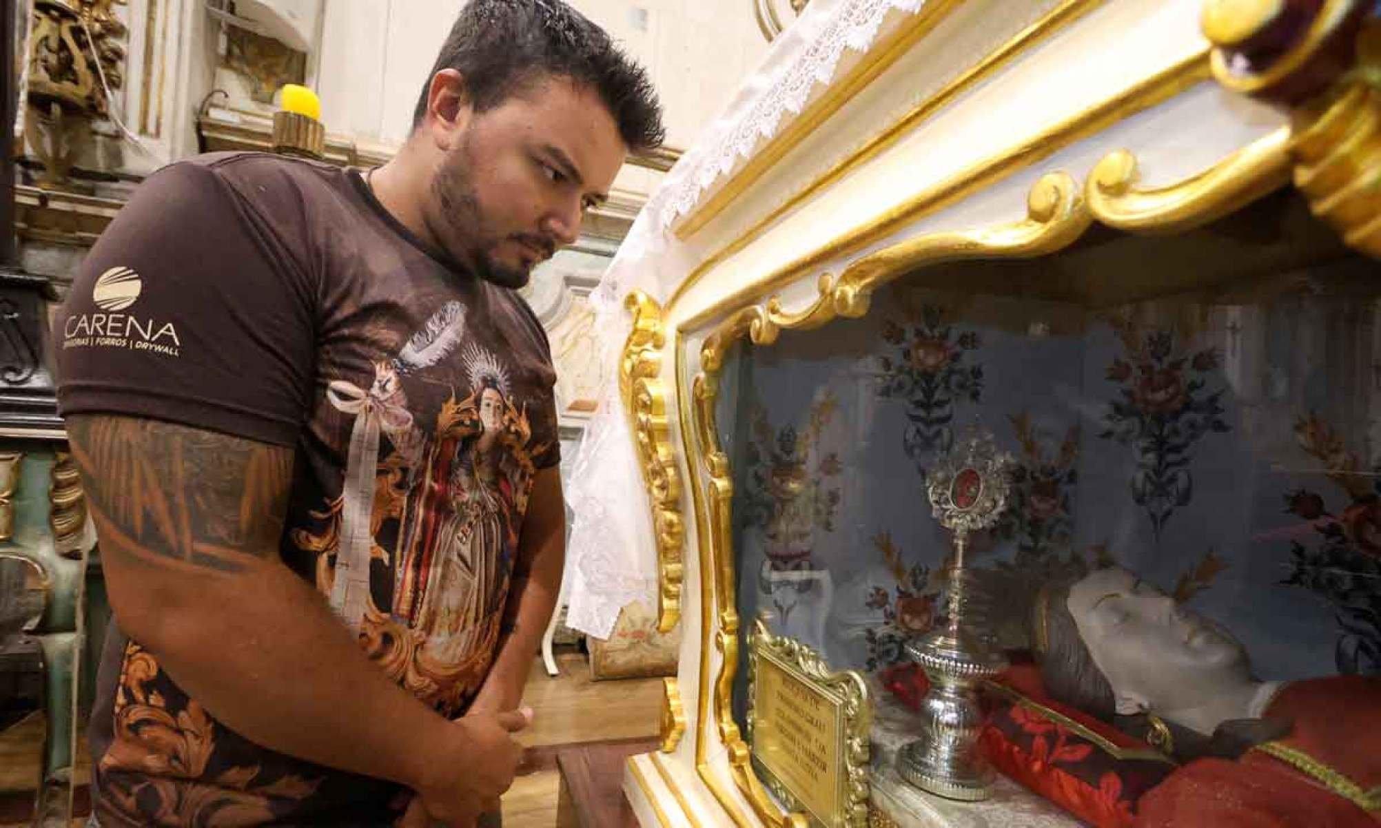 De joelhos, ao lado da relíquia, o empresário Daniel Orzil, de 27 anos, residente na cidade, gostou de saber mais sobre a história de Santa Luzia e a importância de se ter, no santuário, o fragmento do osso da padroeira e protetora da visão. “Venho aqui desde criança, sou devoto, tenho muita fé”, contou o jovem que usava uma camisa do jubileu da santa.