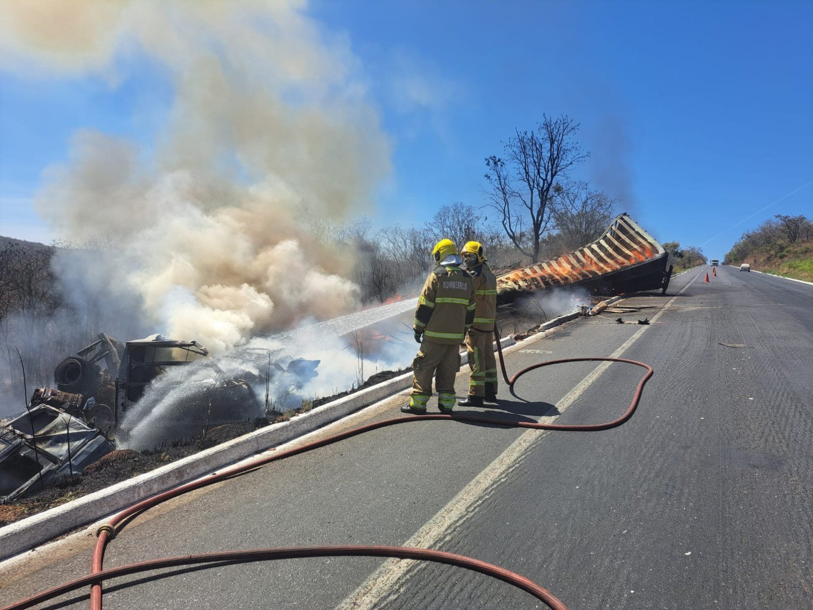 Um motorista, de 49 anos, morreu carbonizado após ficar preso às ferragens da carreta que dirigia e que pegou fogo na BR-251, em Salinas (MG), no Norte do estado, nessa quarta-feira (20/8). O veículo transportava MDF, um material altamente inflamável, e teve a cabine e a carga queimadas.
