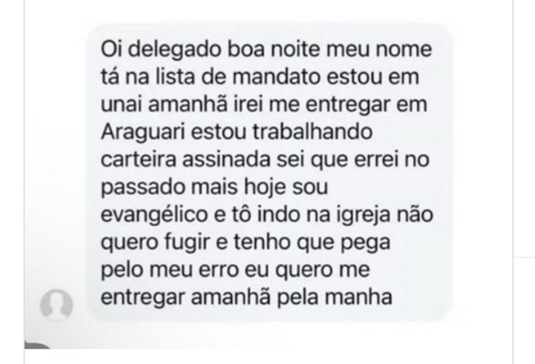 Na mensagem enviada ao delegado, o jovem disse estar arrependido de sua vida no crime, que se converteu evangélico e gostaria de "pagar pelo erro" cometido. "Oi, delegado, boa noite. Meu nome tá na lista de mandato, estou em Unaí. Amanhã, irei me entregar em Araguari. Estou trabalhando de carteira assinada, sei que errei no passado, mas hoje sou evangélico e tô indo na igreja. Não quero fugir e tenho que pagar pelo meu erro. Eu quero me entregar amanhã pela manhã", disse ele na mensagem a Storti.