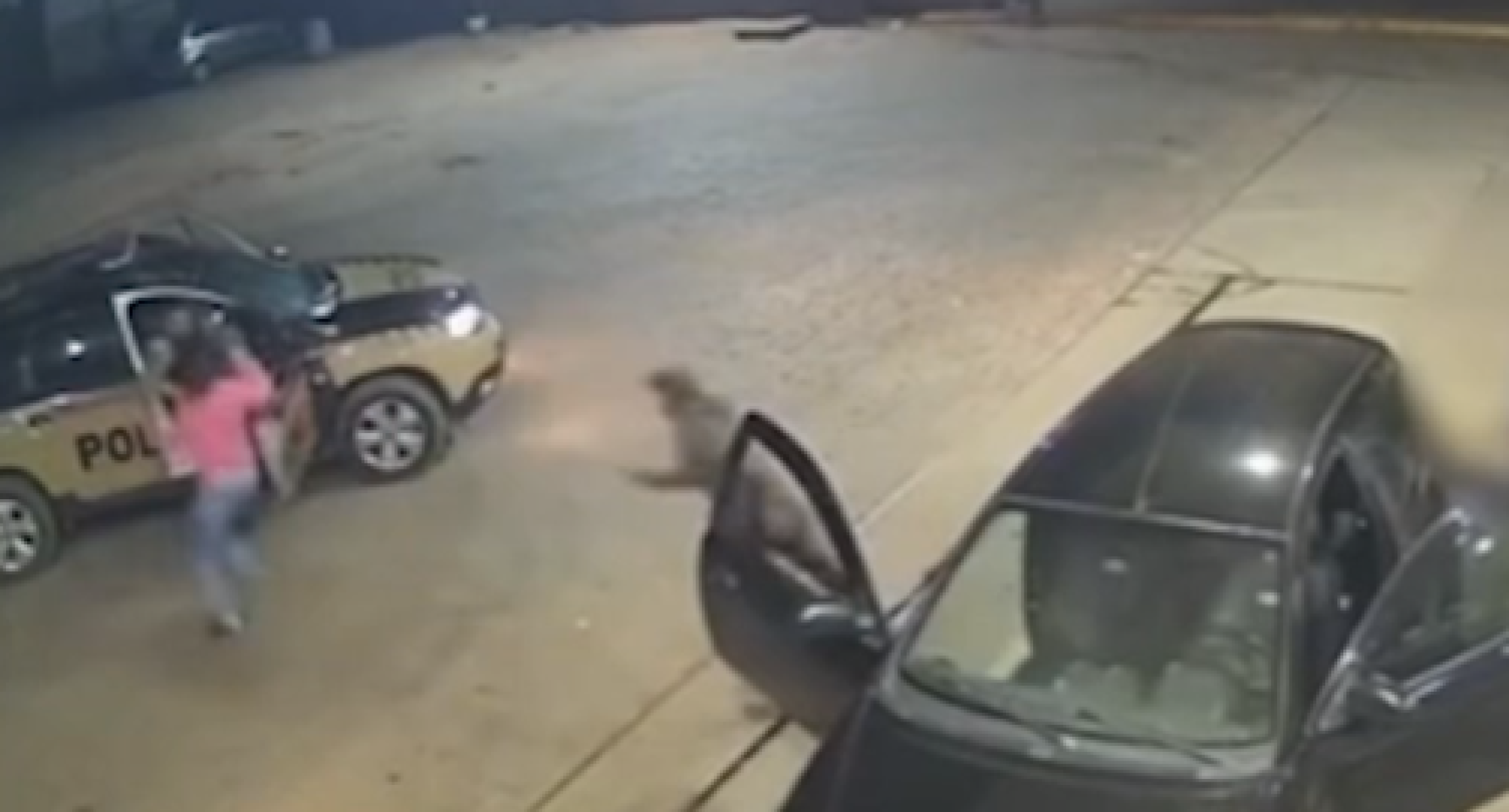 A ação rápida da vítima foi flagrada pelo sistema de segurança do estabelecimento. Nas imagens é possível ver o momento que carro em que ela e o homem estavam chegando ao local. Ele estaciona ao lado de uma bomba de gasolina e sai do carro. Depois de um tempo, uma viatura da Polícia Militar de Minas Gerais entra no pátio do posto. Em questão de segundos, a mulher abre a porta do veículo e corre em direção aos policiais.