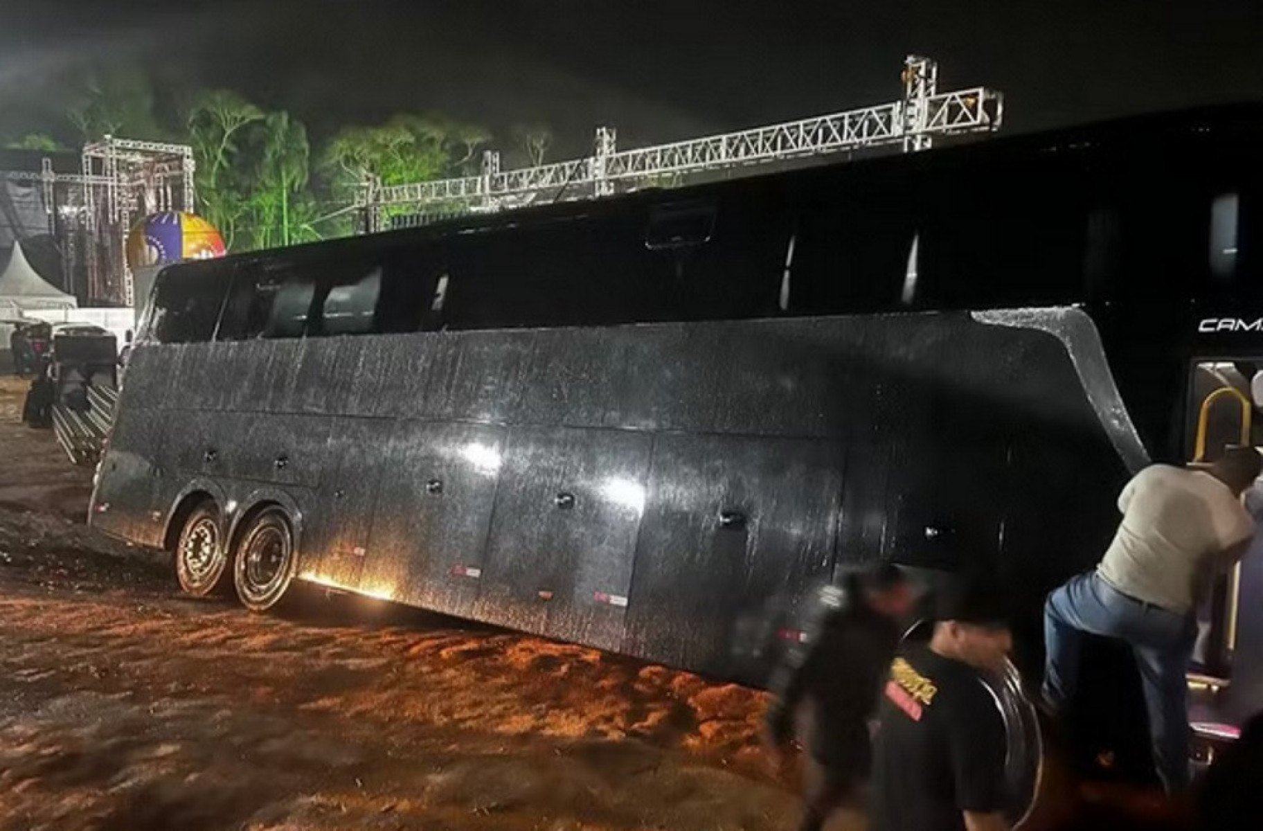 O veículo teve que ser removido durante a chuva, após oito horas de operação, como contou o vocalista Bruno Gouveia nas redes sociais. "Muito trabalho, muito sacrifício, no meio da chuva e tudo para conseguir tirar o ônibus da vala", relatou.