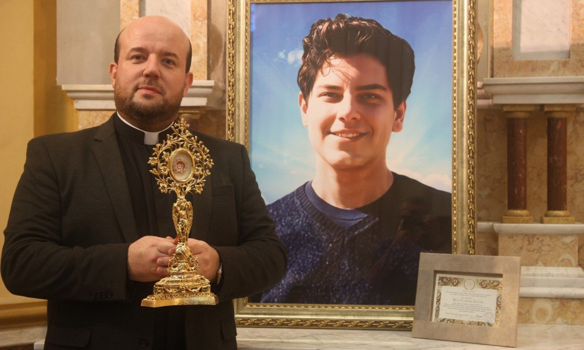 No relicário a ser exposto em novo altar do templo, encontra-se um fragmento da pele (“ex corpore”, em latim) de Carlo Acutis (1991-2006), o jovem nascido na Inglaterra e criado em Milão, Itália, que vai se tornar santo – São Carlo Acutis – em cerimônia amanhã, na Praça São Pedro, no Vaticano (às 5h, horário de Brasília; em Roma, às 10h). Será a primeira cerimônia de canonização no pontificado de Leão XIV, com a santificação também do italiano de Turim, Pier Giorgio Frassati (1901-1925).
