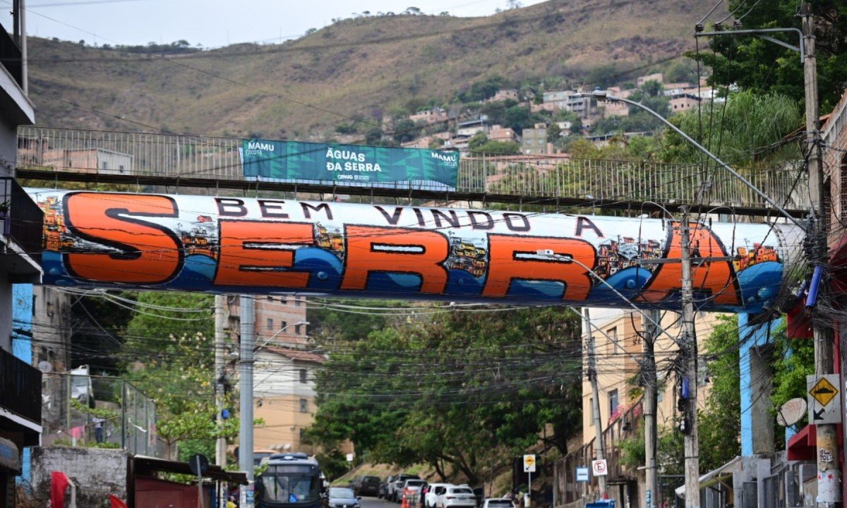 A intervenção artística faz parte do projeto Morro Arte Mural (Mamu), que faz megamurais em fachadas de casas. A quarta edição da iniciativa entregou um mosaico composto por 34 casas do Aglomerado da Serra com uma arte homenageando os cursos d’água que passam por ali e fazem parte da história local.