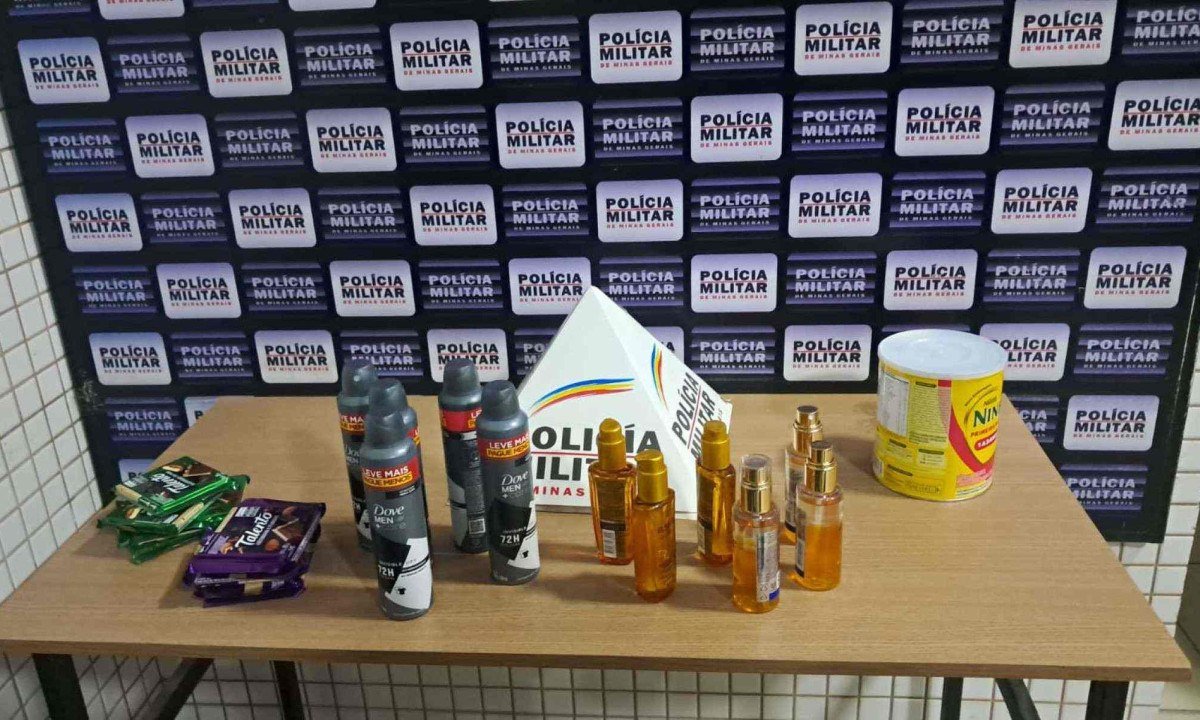 Durante a busca, os militares encontraram os suspeitos ainda com as mesmas roupas usadas no furto. Na mochila que estava com a mulher foram encontrados cinco desodorantes, dez barras de chocolate, seis óleos capilares e uma lata de leite em pó, avaliados em R$ 523. Os produtos foram reconhecidos pela farmácia, que confirmou o crime.