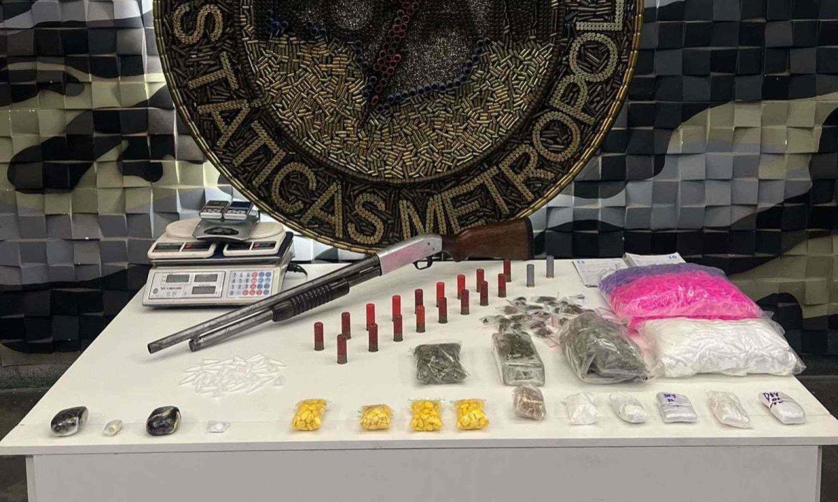 As buscas seguiram e, no quarto do jovem, os militares encontraram porções de maconha e haxixe, comprimidos de ecstasy, barras de cocaína, balanças digitais e uma caderneta com anotações do tráfico. As buscas também resultaram na apreensão de uma espingarda e munições.