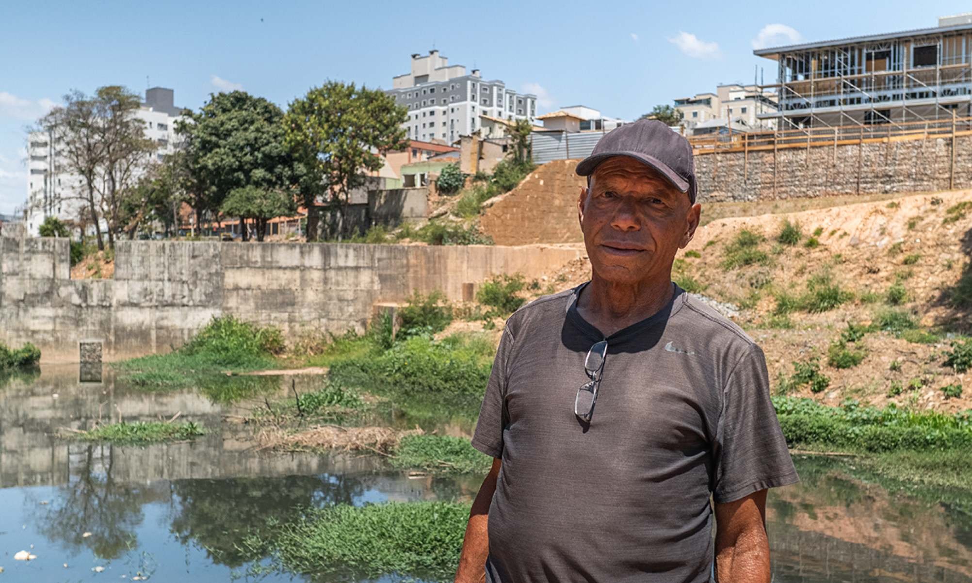 No Córrego Lareira, outra sub-bacia do Nado, o problema é diferente. Apesar de não conviver com a água de esgoto dentro de sua casa, o aposentado Nelson Lopes, 64, reclama da água suja que fica empoçada nos dois piscinões de concreto armado feitos pela prefeitura em 2022, na altura do Bairro São João Batista, também em Venda Nova.