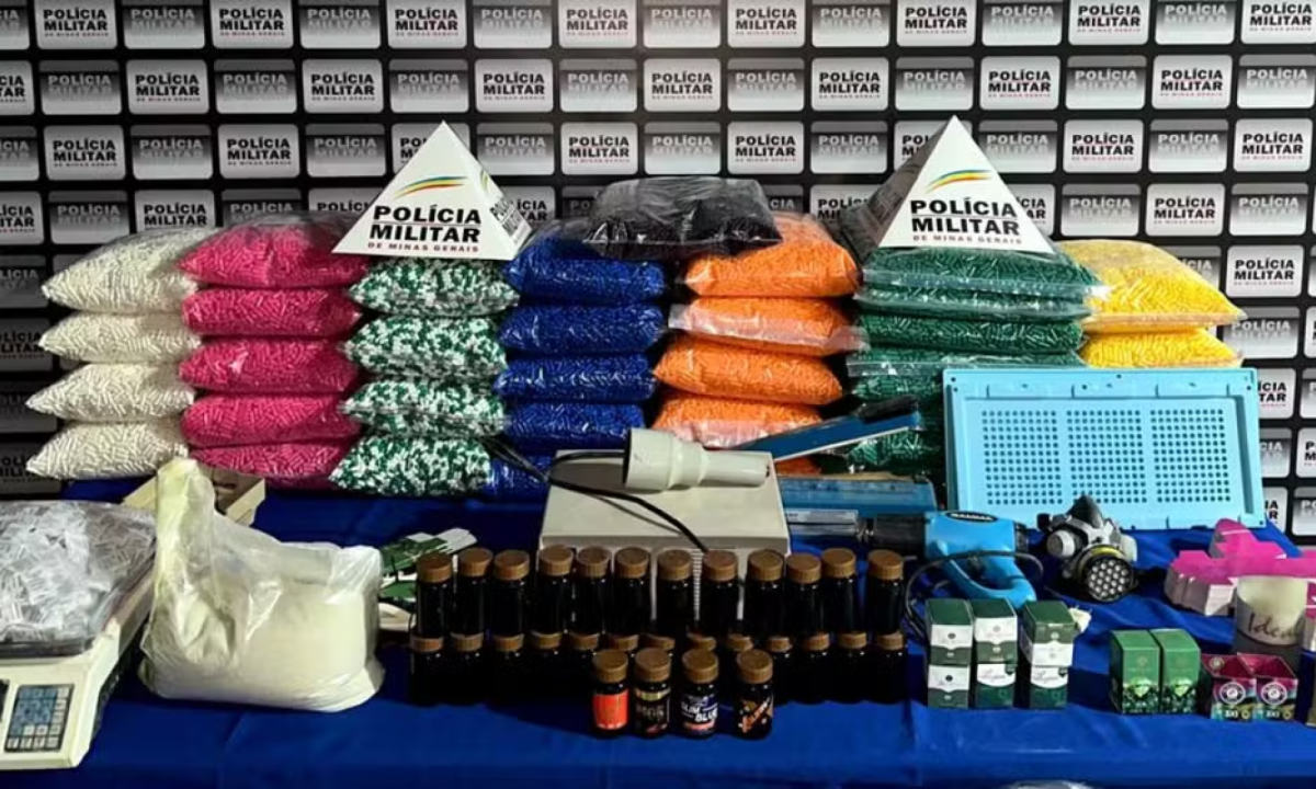 Frascos de colágeno, emagrecedores e analgésicos prontos para venda foram encontrados no imóvel. Os militares ainda apreenderam 4 kg quilos de matéria-prima, um secador industrial e balanças.