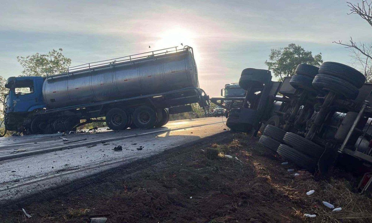 Devido ao impacto da batida, a caminhonete foi arremessada para fora da pista e ficou de cabeça para baixo. Parte da carga do caminhão tombou e ficou atravessada na via, impedindo o trânsito nos dois sentidos.