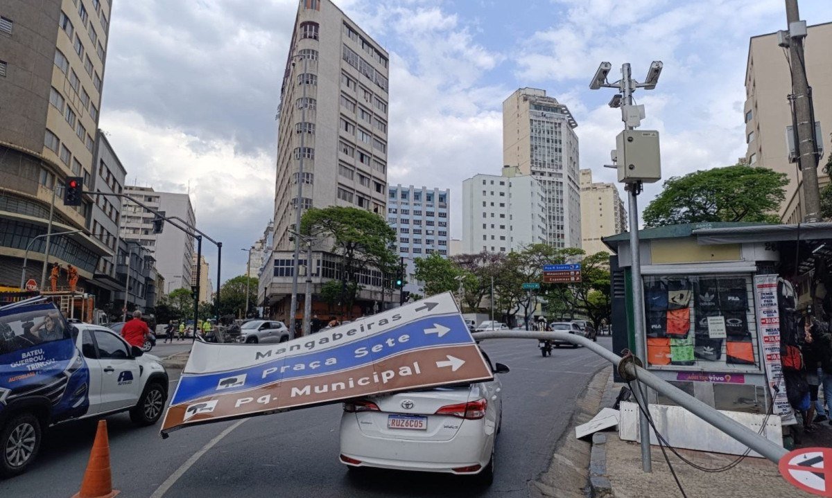 Placa de sinalização cai em cima de táxi no Centro de BH