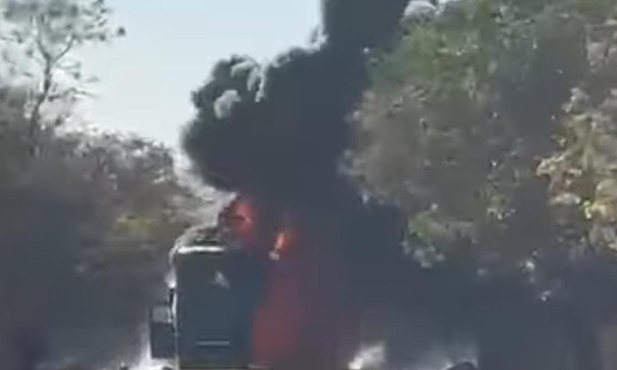 Ônibus com time de futebol pega fogo em rodovia de Minas