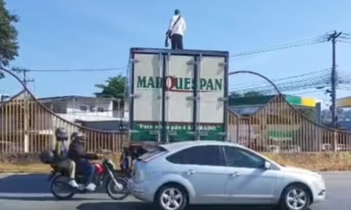 Durante o protesto, o homem atravessou o caminhão, bloqueando duas faixas da avenida, e subiu no baú com um galão de combustível, ameaçando incendiar o veículo.