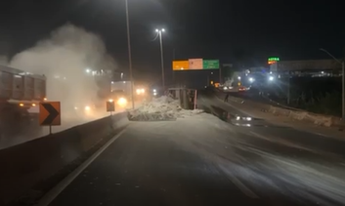 Vídeos feitos por motoristas mostram a carreta tombada e a carga espalhada, além de muita poeira no local do acidente.