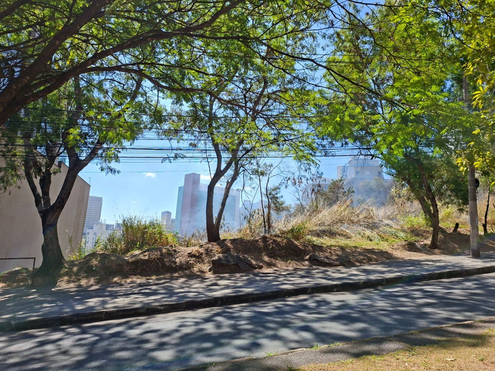 Imagens registradas pela reportagem mostram que, motoristas e pedestres que passaram pela avenida, puderam observar a fumaça subindo do lote por trás das árvores.