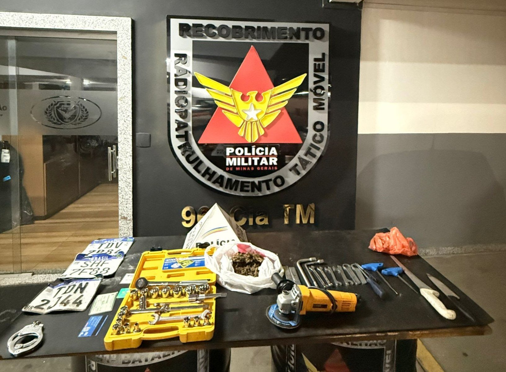 Antes de chegar na casa, os militares avistaram no chão diversas peças desmontadas de motos, além de equipamentos para corte de peças metálicas. Conforme os registros, quatro placas foram encontradas. Duas delas tinham queixa de furto, outra era clonada e a última não teve a origem definida.