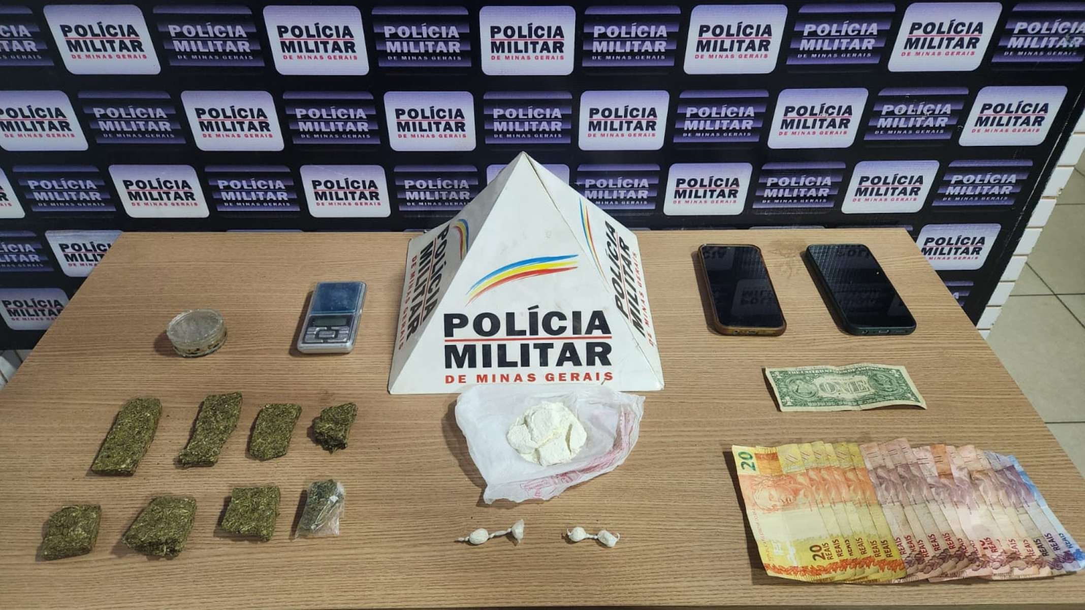 Tabletes de maconha, cocaína, dinheiro em espécie em dólar e real, celulares, um dichavador e balanças de precisão estavam dentro da bolsa.