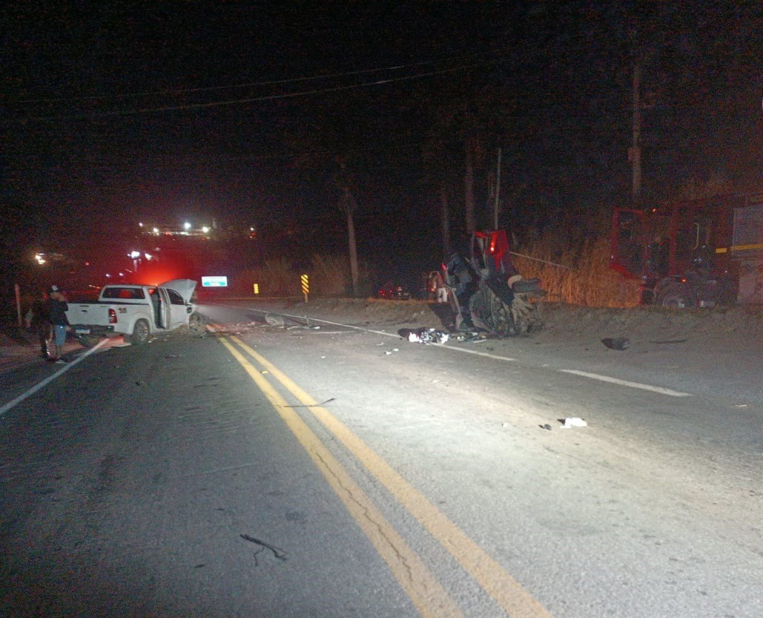 Uma equipe do Corpo de Bombeiros encontrou uma caminhonete Toyota Hilux no centro da pista, com os airbags acionados, sem nenhum ocupante. Às margens, estava um Fiat Palio tombado, com o motorista preso às ferragens.