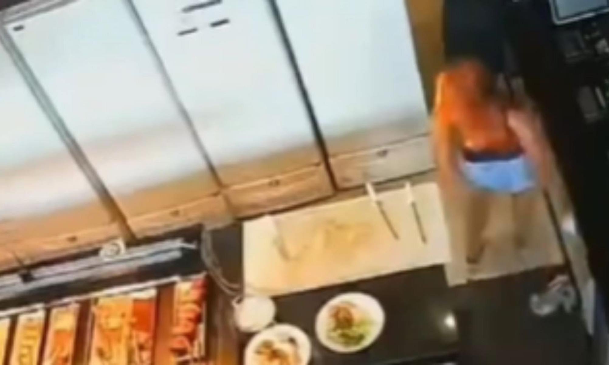 Imagens de câmeras de segurança mostram a mulher correndo com os cabelos em chamas. Ela foi socorrida por funcionários do restaurante.