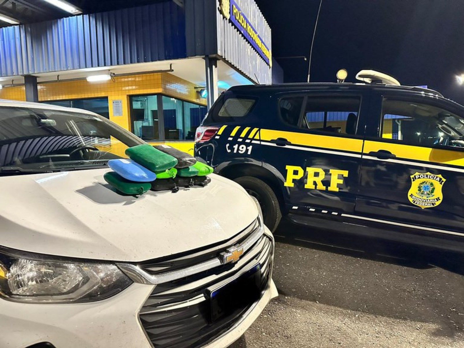 Os agentes vistoriaram o veículo e encontraram uma caixa de papelão no porta-malas. No interior, estavam tabletes de maconha. Conforme os registros, a carga encontrada pesa 11 quilos.