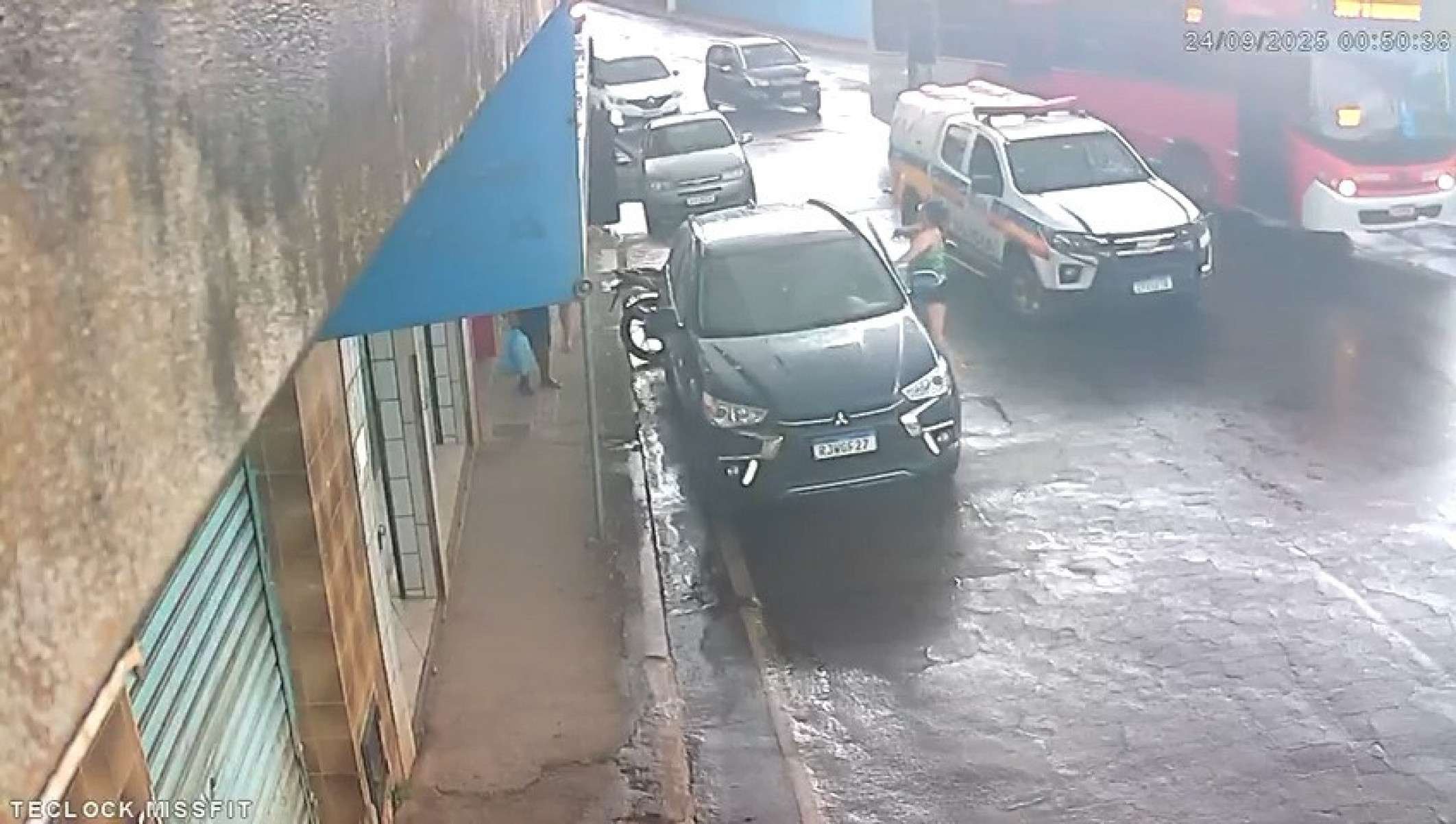 Imediatamente, a viatura vai em direção ao veículo e de lá de dentro, o motorista desce do carro, pega a criança de sete meses no colo da mãe no banco traseiro e vai em direção aos policiais.