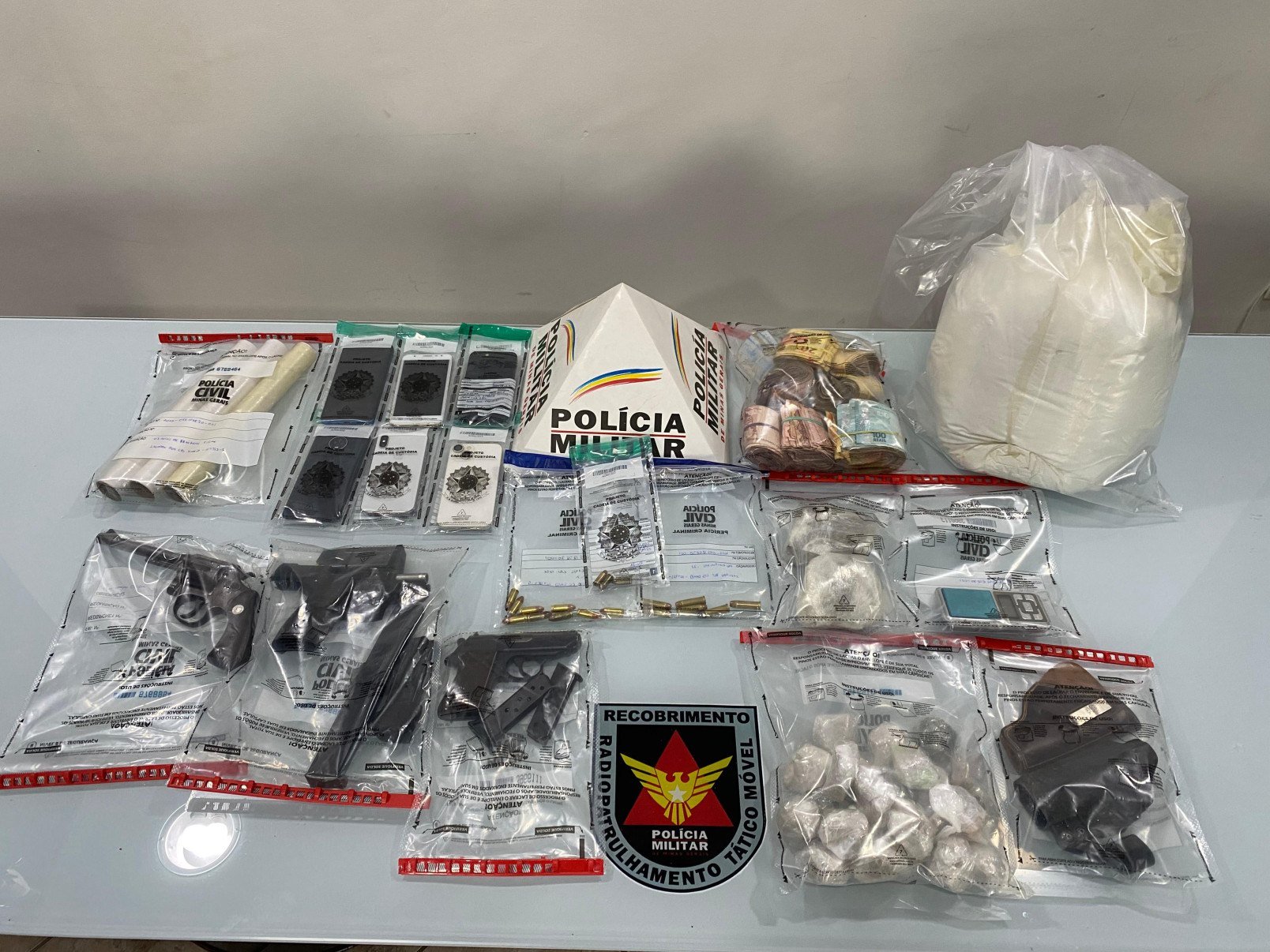 Nas casas e no carro, os militares encontraram três armas de fogo, munições e carregadores de calibres variados, uma balança de precisão, porções de maconha, crack e cocaína e R$ 15.445,00 em dinheiro vivo.