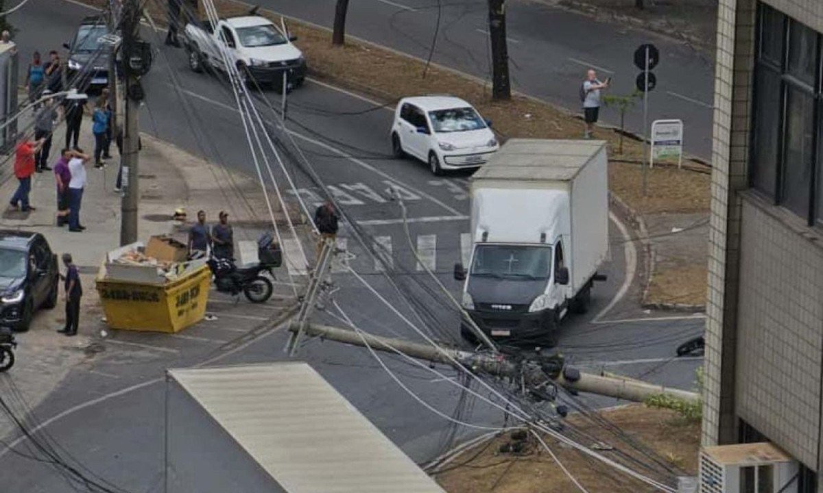 Uma carreta derrubou três postes ao puxar a fiação de rua no bairro Estoril, na Região Oeste de Belo Horizonte (MG), que está sem energia.