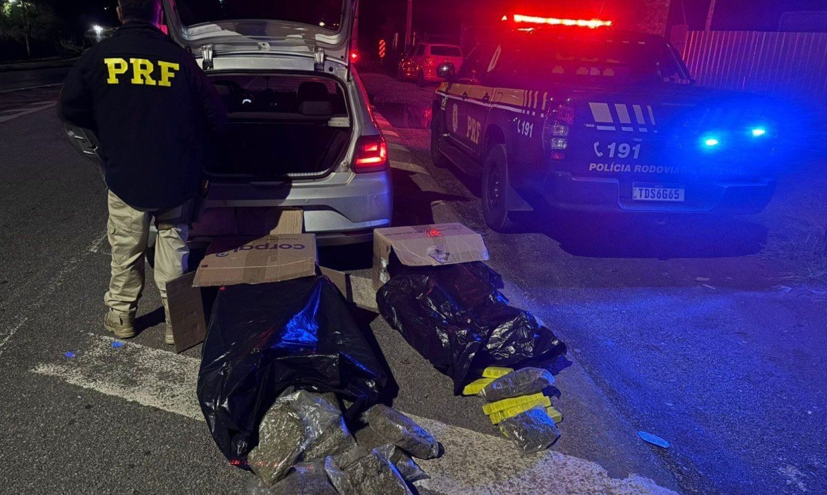 Um carregamento de 48 quilos de maconha e skunk, avaliado em aproximadamente R$ 450 mil, foi apreendido pela Polícia Rodoviária Federal (PRF) na madrugada deste domingo (19/10), por volta das 4h15.