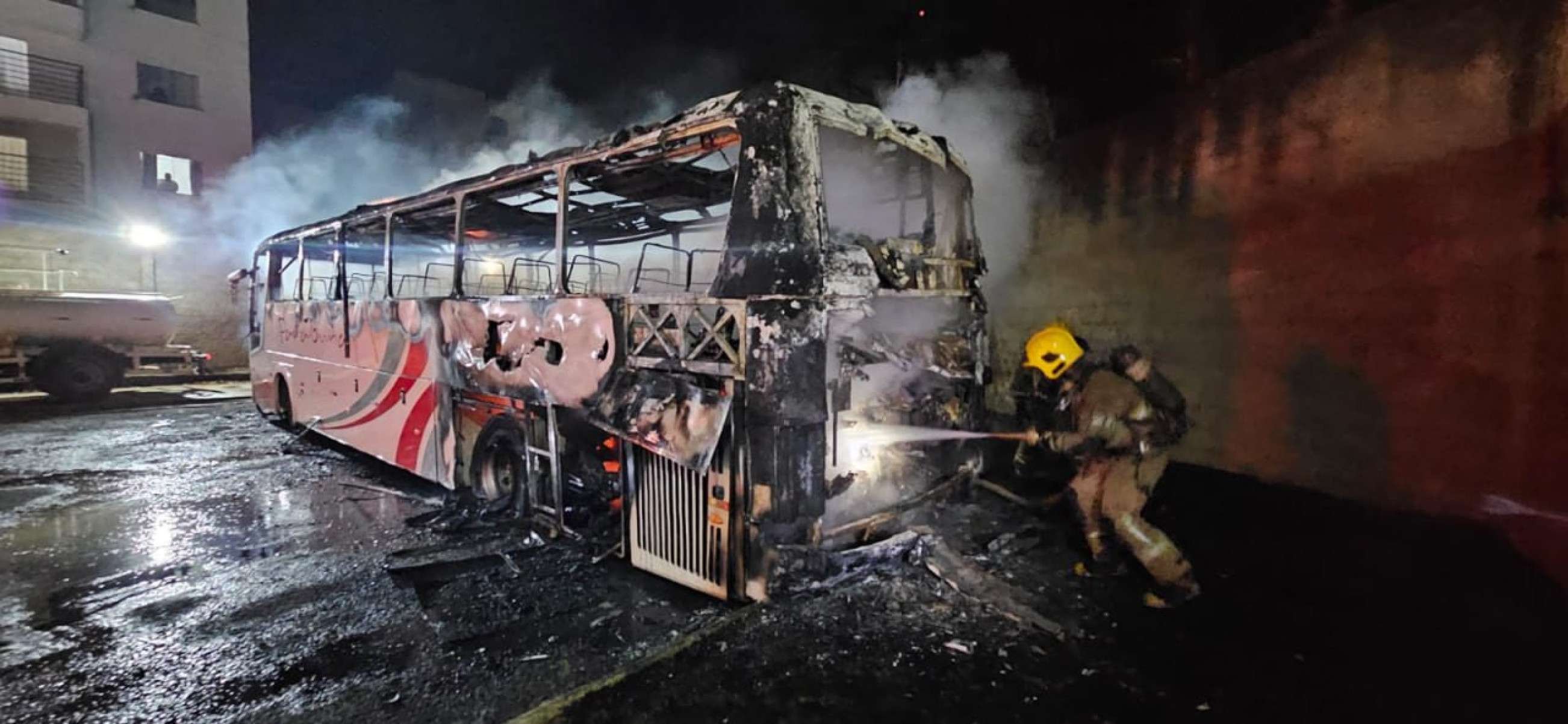 Um ônibus foi totalmente destruído após pegar fogo em uma garagem de Matias Barbosa (MG), na Zona da Mata mineira, na tarde dessa quinta-feira (2/10).