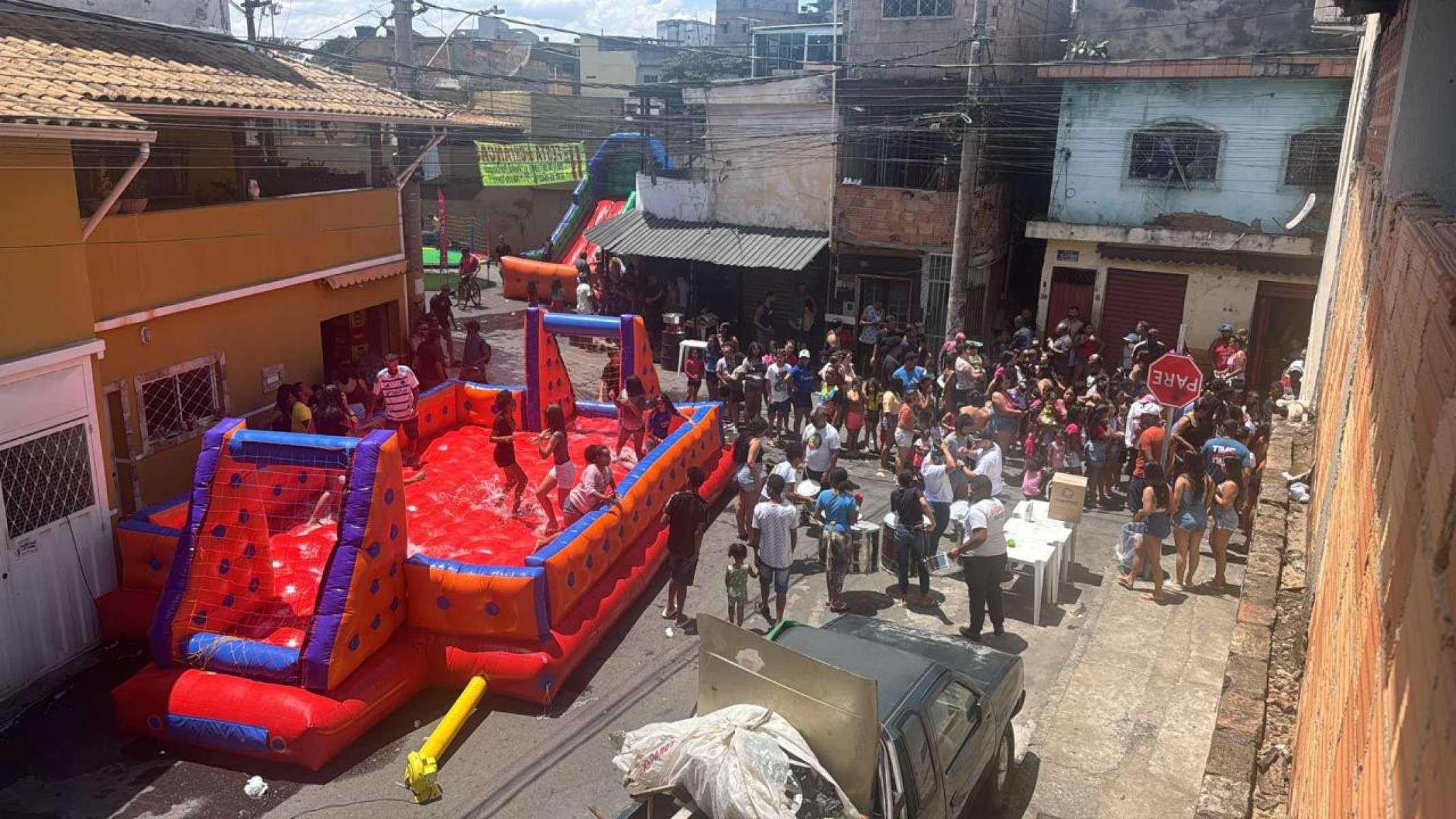 Vídeos mostram a rua cheia de famílias e crianças participando da comemoração, com música, brinquedos infláveis e futebol de sabão.