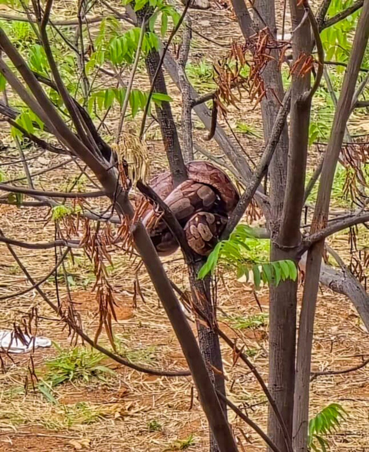 Uma jiboia foi encontrada por moradores em uma árvore dentro de um lote vago no Bairro Serrano, na Região da Pampulha, em Belo Horizonte, na tarde desta terça-feira (14/10). O Corpo de Bombeiros foi acionado para realizar a capturar do animal, mas não o removeram.