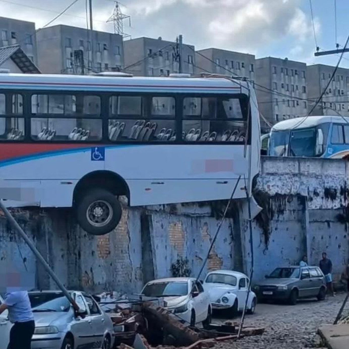 Um ônibus ficou pendurado no muro da garagem de uma empresa de transporte coletivo em Barbacena (MG), no Campo das Vertentes, nessa quarta-feira (15/10).