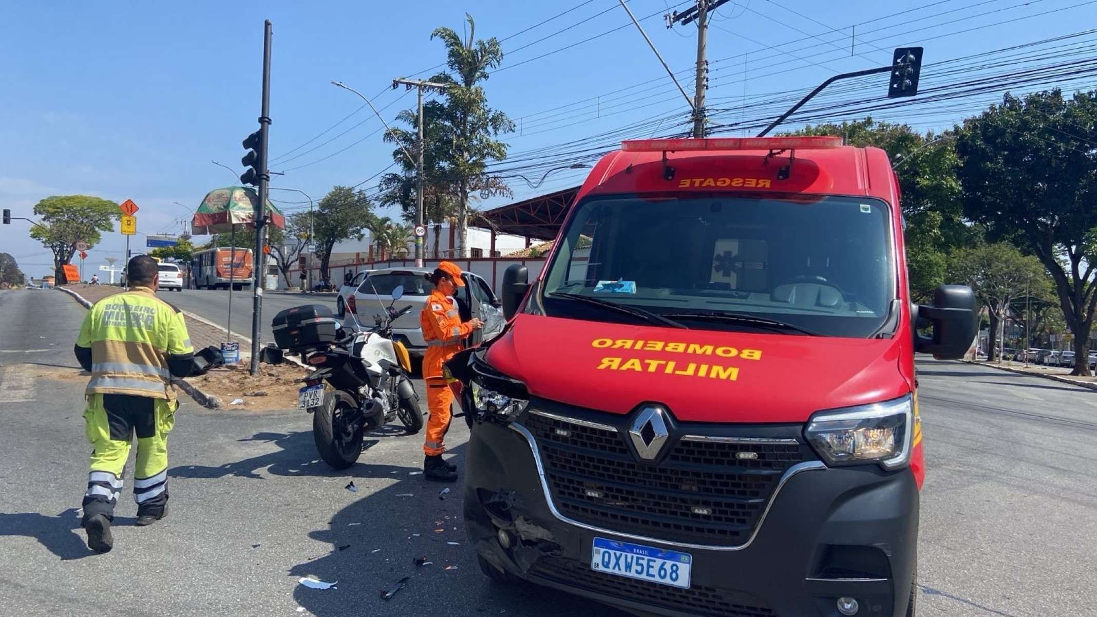 Um acidente envolvendo um veículo de passeio e uma viatura do Corpo de Bombeiros deixa o trânsito lento na manhã desta sexta-feira (17/10), em Contagem (MG), na Região Metropolitana de Belo Horizonte.