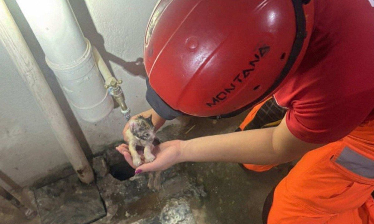 MG: filhote de gato cinzento quase submerso é resgatado em rede de drenagem