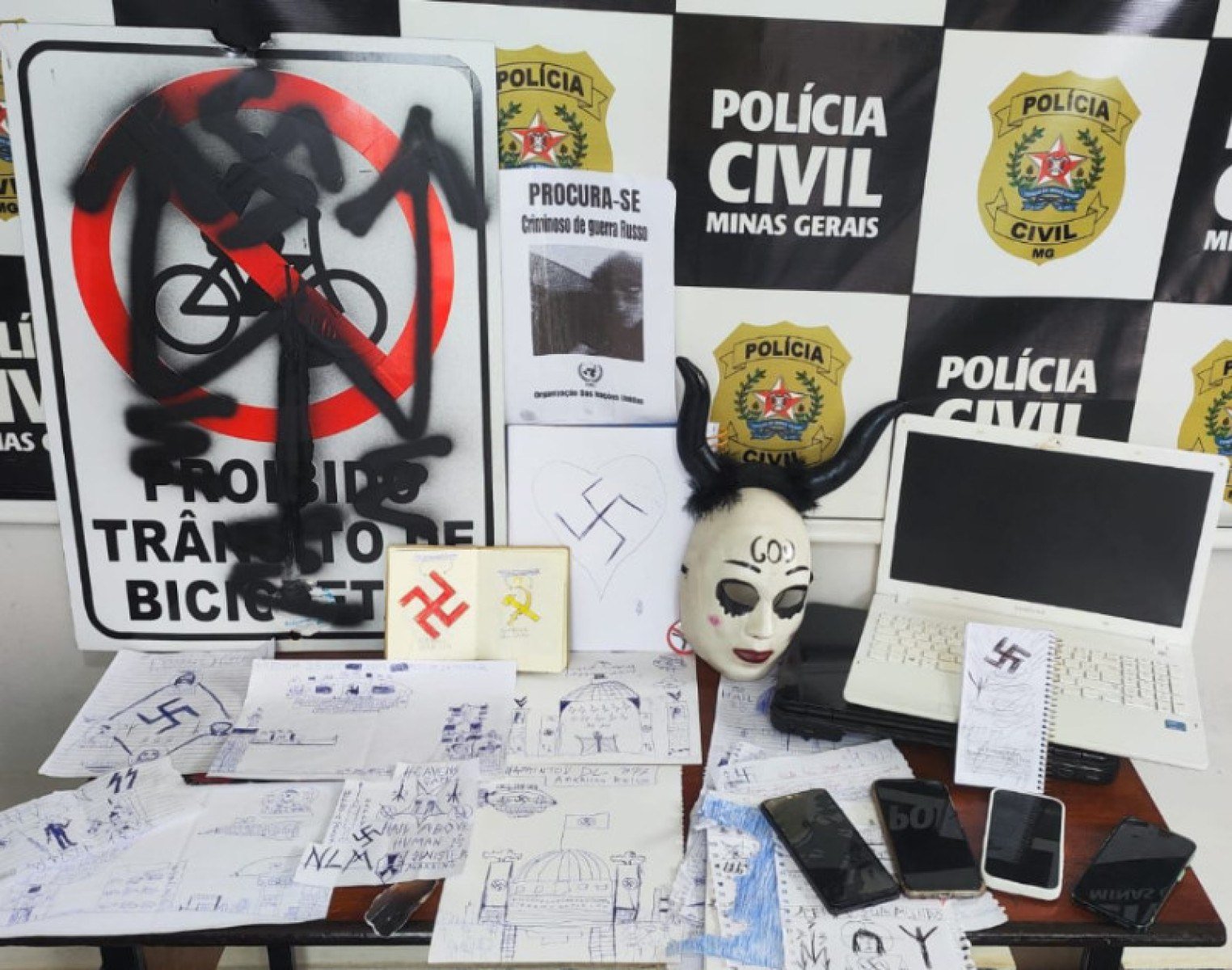 Conforme os registros, foram apreendidos celulares, computadores e diversos materiais com apologias ao nazismo, discurso de ódio e incitação à violência contra grupos minoritários.
