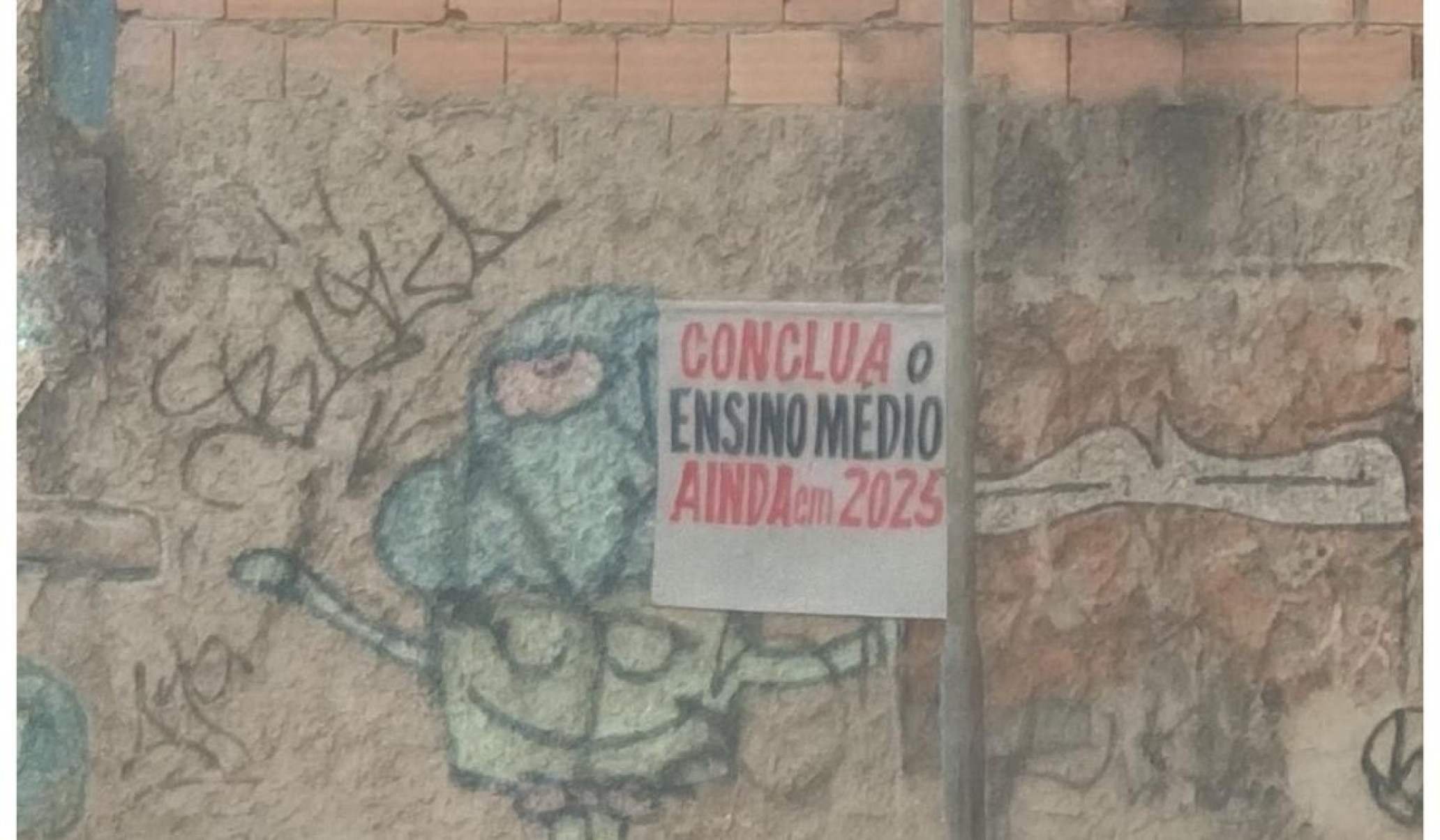 Um cartaz que promete a conclusão do Ensino Médio ainda em 2025 está instalado na Av. dos Andradas, próximo a Praça da Estação, na Região Central de BH. O anúncio conta com um número para contato e não explica como é possível conseguir o diploma em apenas dois meses.