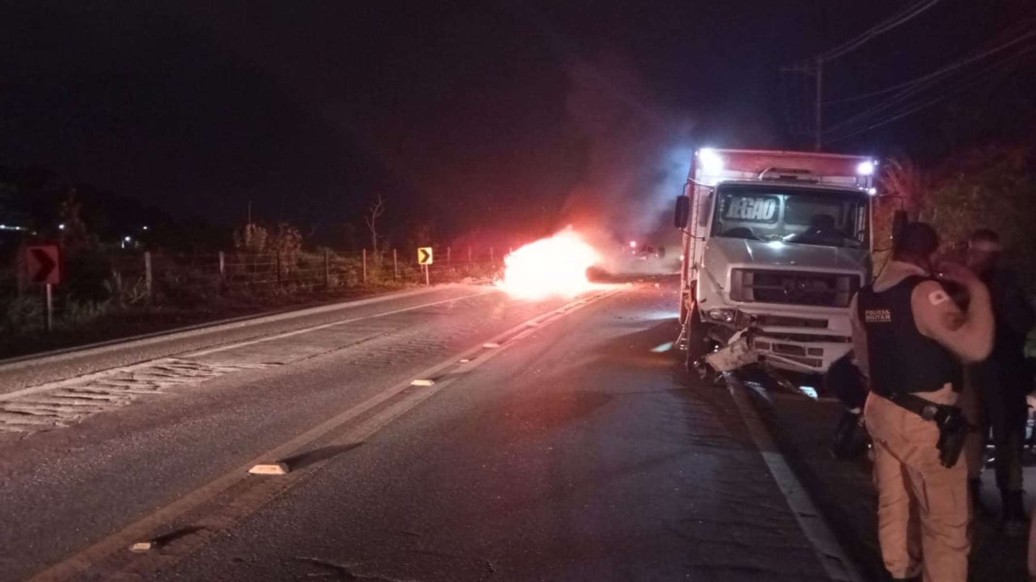 Um carro que trafegava na BR-259 para a BR-116, na altura do quilômetro 168, em Governador Valadares (MG), invadiu a contramão, bateu em um caminhão e pegou fogo na noite dessa quinta-feira (20/11).